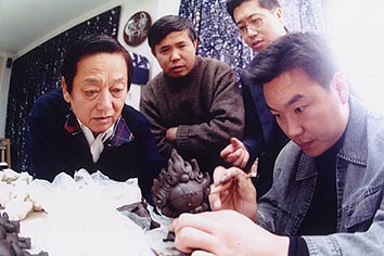 正是在放大巨雕《鳩頂澤瑞》時,趙金鑫有了更多聆聽大師教誨的機會。他為大師的藝術(shù)而著迷,為大師的人格所震撼,更為大師的藝術(shù)追求所折服。僅放大巨雕最上部的那只鳩鳥頭部,韓美林就親自修改了十余次,年逾六旬的他甚至攀上十余米高的工作架上修改泥稿。從那時起,趙金鑫的心里就只有藝術(shù),只有永無止境的藝術(shù)追求,所以韓老師也極賞識、信任這位干活不要命的"山西娃"?,F(xiàn)在我們就不難理解,韓美林先生為何邀請趙金鑫參與奧運吉祥物創(chuàng)作了吧。也許,有人會說他"近水樓臺先得月",才成為"福娃"四"爹"之一。此時,他露出樸實的笑容,堅定地說:"如果沒有真本事,就是湊在月亮邊上,也得不到月亮。