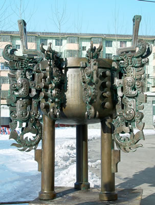 韓美林先生欣然接受了邀請,整整一個(gè)月時(shí)間,數(shù)易其稿,他參考了夏、商、周時(shí)期的青銅鼎的特點(diǎn),又融進(jìn)了楚漢風(fēng)格,突破了傳統(tǒng)意義上鼎的模式,體現(xiàn)出新世紀(jì)的現(xiàn)代風(fēng)格,不僅要讓人欣賞到它的偉岸之軀,雋永之美,還要能讓人體驗(yàn)到它的親近之情,感受到它與傳統(tǒng)文化的一脈相承。設(shè)計(jì)稿一脫稿,立即受到央視春節(jié)聯(lián)歡晚會(huì)劇組的歡迎,央視領(lǐng)導(dǎo)與有關(guān)專家也交口稱贊。
