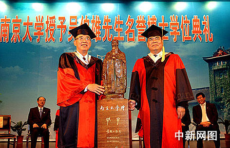 2009年5月31日上午,在南京大學(xué)禮堂內(nèi)隆重舉行授予國(guó)民黨黨主席吳伯雄先生法學(xué)名譽(yù)博士學(xué)位典禮。南京大學(xué)向吳伯雄先生贈(zèng)送了珍貴的禮物——《孔子像》,雕像由南京大學(xué)美術(shù)研究院院長(zhǎng)、中國(guó)雕塑院院長(zhǎng)、英國(guó)皇家雕塑家協(xié)會(huì)成員吳為山教授創(chuàng)作。亦是旨在弘揚(yáng)我們共同的文化,促進(jìn)兩岸增進(jìn)共識(shí),增強(qiáng)民族凝聚力。 | |