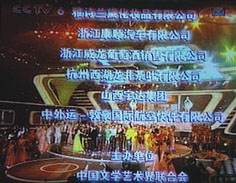 中國電影金雞、百花獎頒獎晚會于2006年10月28日在杭州舉行,中央電視臺三頻道現(xiàn)場直播,山西宇達集團與中國電影界的深厚淵源,其公司名稱出現(xiàn)在鳴謝字幕上。圖為電視照片。